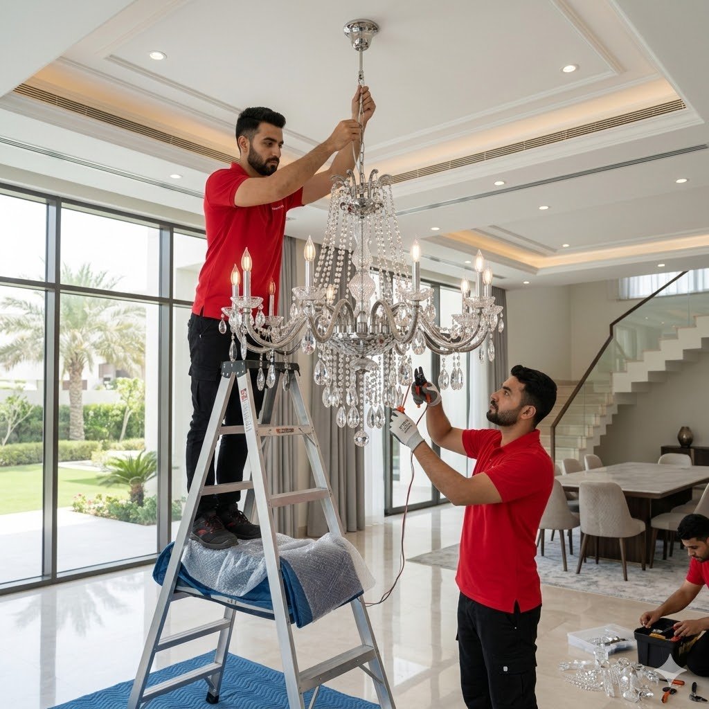 Our team carefully handles delicate crystal components, heavy ceiling fixtures, and complex lighting systems using proper tools, safety equipment, and secure mounting brackets. We ensure correct ceiling support, balanced alignment, and stable electrical connections for long-lasting performance.